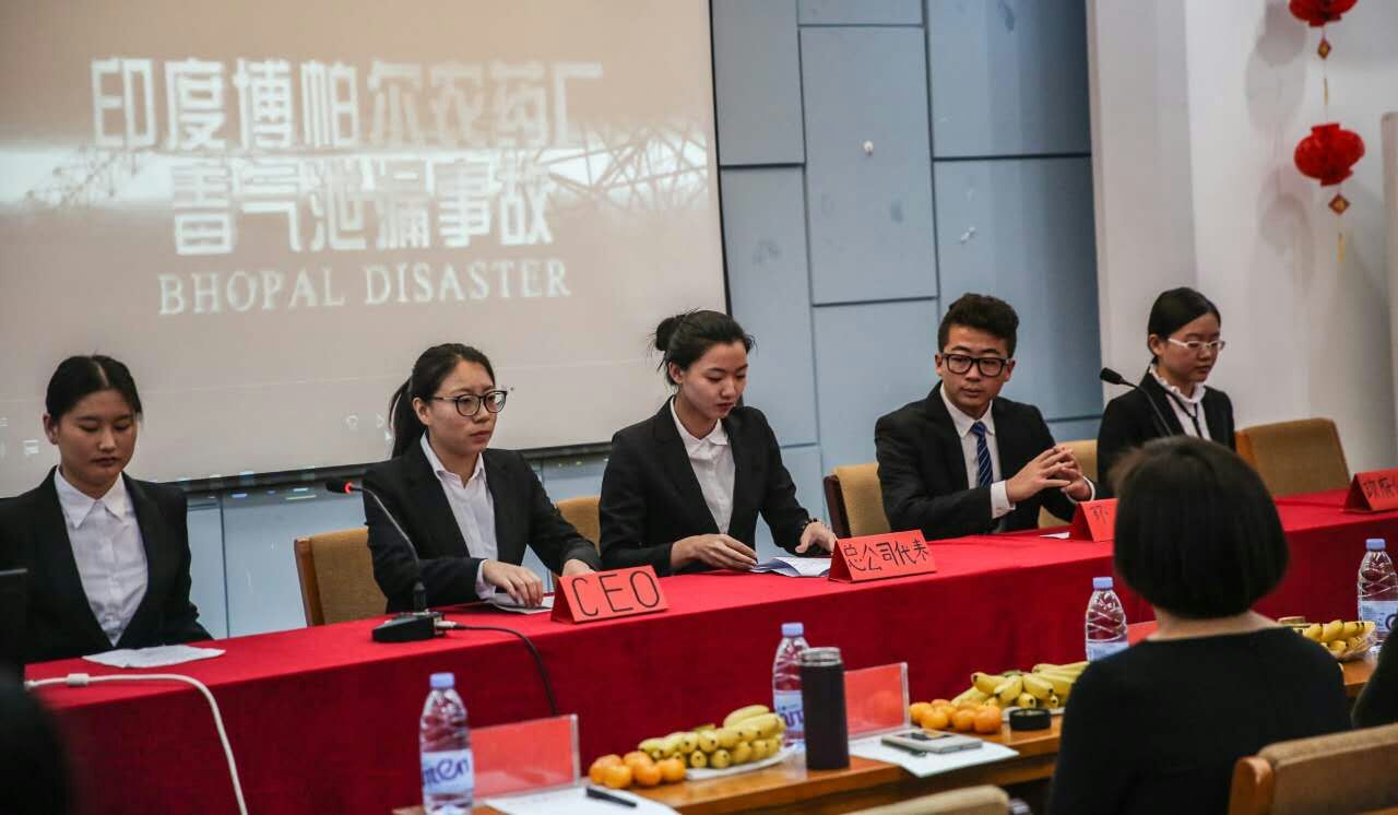 新闻发布会刚一开始,主持人首先通过视频展示还原事发现场,将大家带入印度博帕尔毒气泄漏事件现场,触目惊心的场景冲击着人们的感官,仿佛身临其境;接下来,由学生分别扮演美国联合碳化物公司CEO、印度分公司CEO、印度博帕尔市市长、印度博帕尔市环保专家和新闻发布会主持人,并由其他同学扮演现场记者以及受害者家属代表。新闻发布会开始后,首先由每位负责人先针对自己的角色做出相关陈述,然后台下记者以及受害者家属代表针对发言人的陈述进行提问。整个情景演练过程中,每位同学全身心的投入角色,现场气氛紧张又沉重,记者们的提问即犀利又有针对性,台上的发言人需要具备较强的随机应变能力才能不激化矛盾、控制事情蔓延的速度。到场的每一位嘉宾从专业的角度对同学们的表现进行了精彩点评,即肯定了每一位同学的表现,也从同学们表演的细枝末节中提出相应的改进意见,在场的每一位同学都受益匪浅。